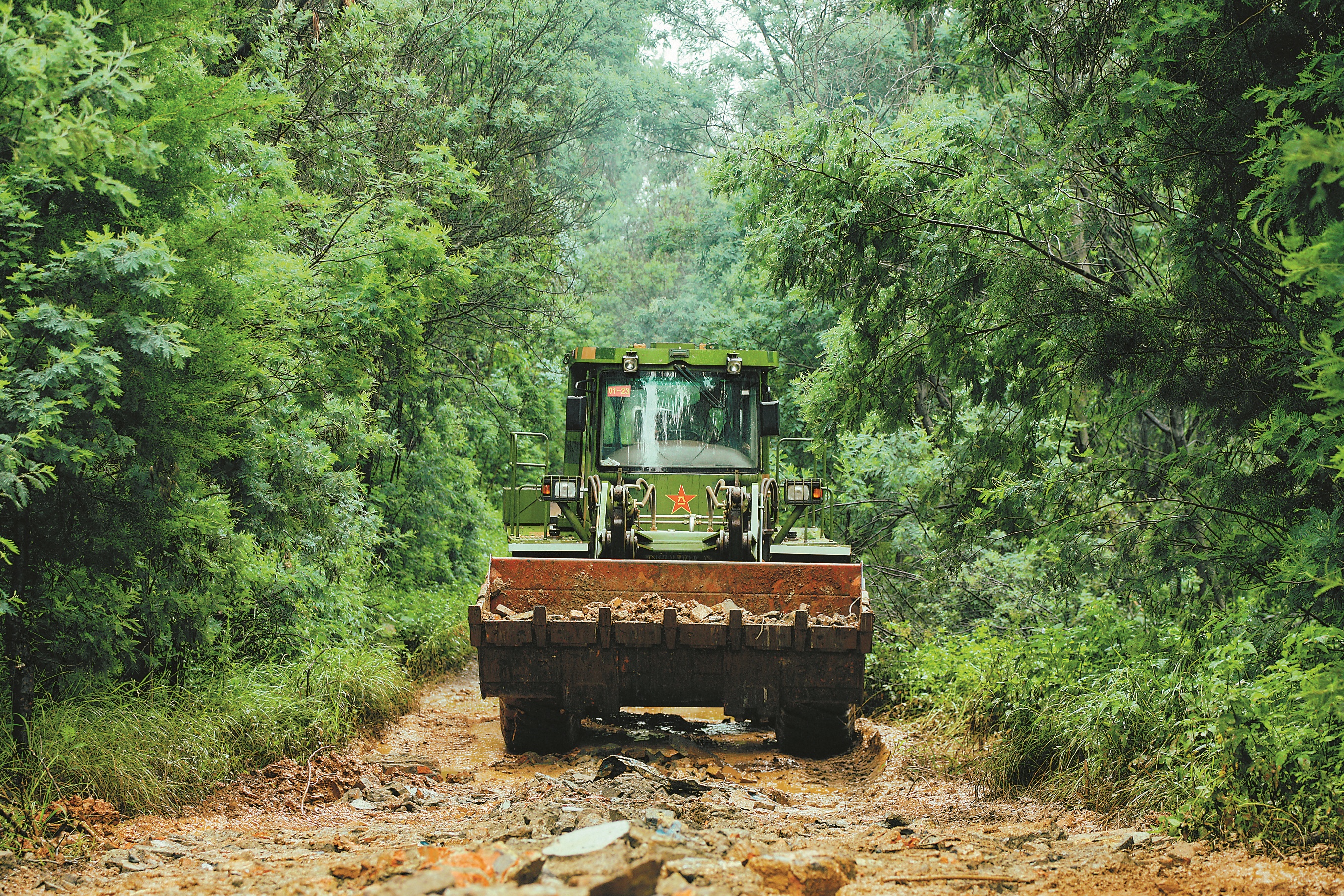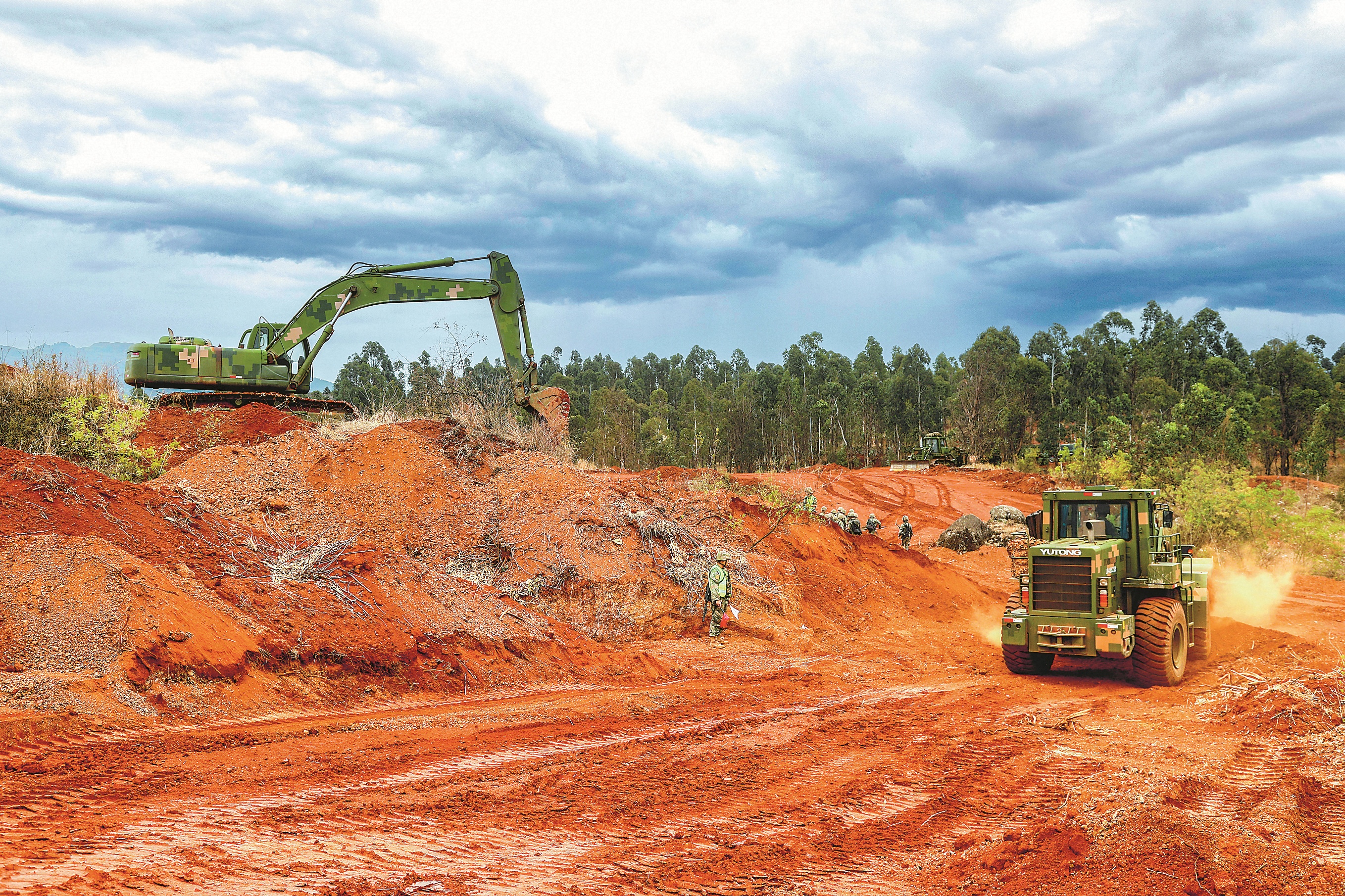 雨声、人声、机械轰鸣声交织。这些官兵的任务,是在规定时间内构筑起包含多个车辆掩体、地下掩蔽部及交通壕的工事体系。